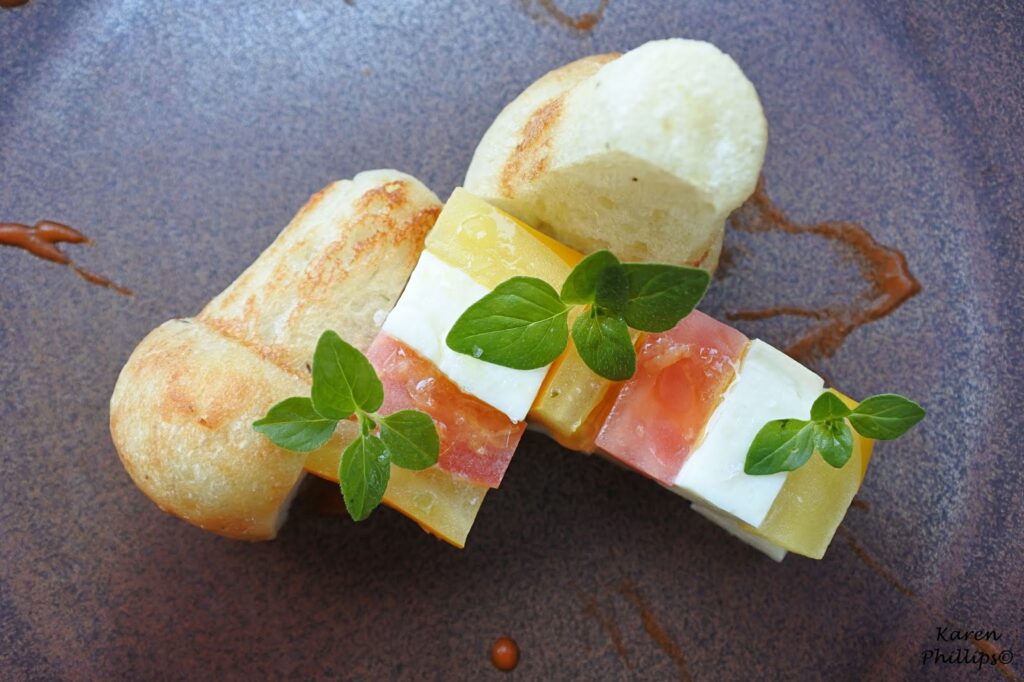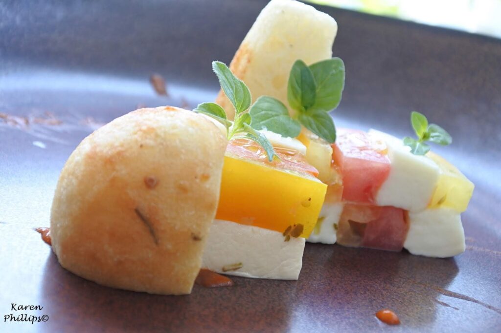 These tomatoes are grown in the thermal parks huge garden, a garden where the chef gets many of the vegetables herbs and spices he needs for his recipes. Alongside that fiordilatte from the Sorrento Peninsula.