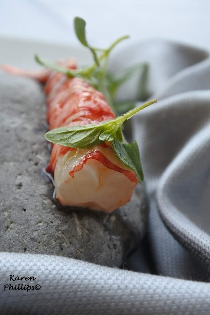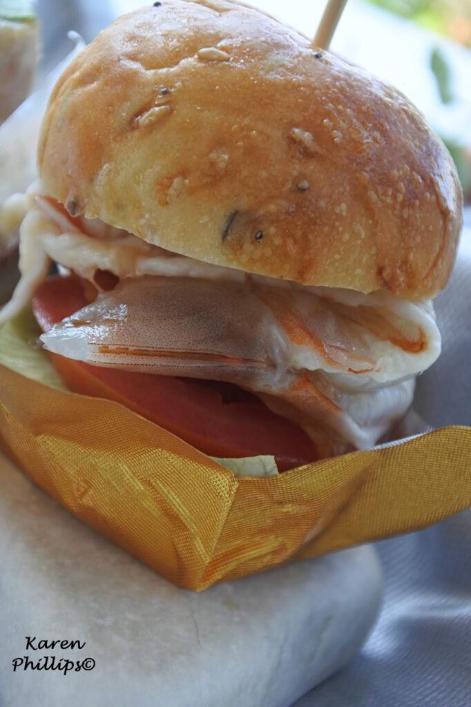 then a mini sandwich on a homemade bun filled with mazzancolle shrimp ceviche style,