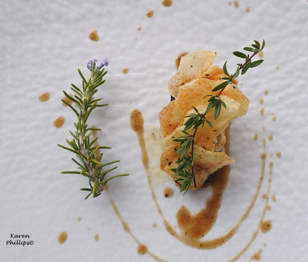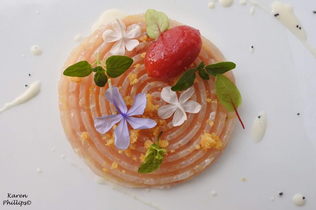 Then an amberjack spriral which is basically an amberjack tartare seasoned with salt, pepper, oil infused with lemon leaves and zest.