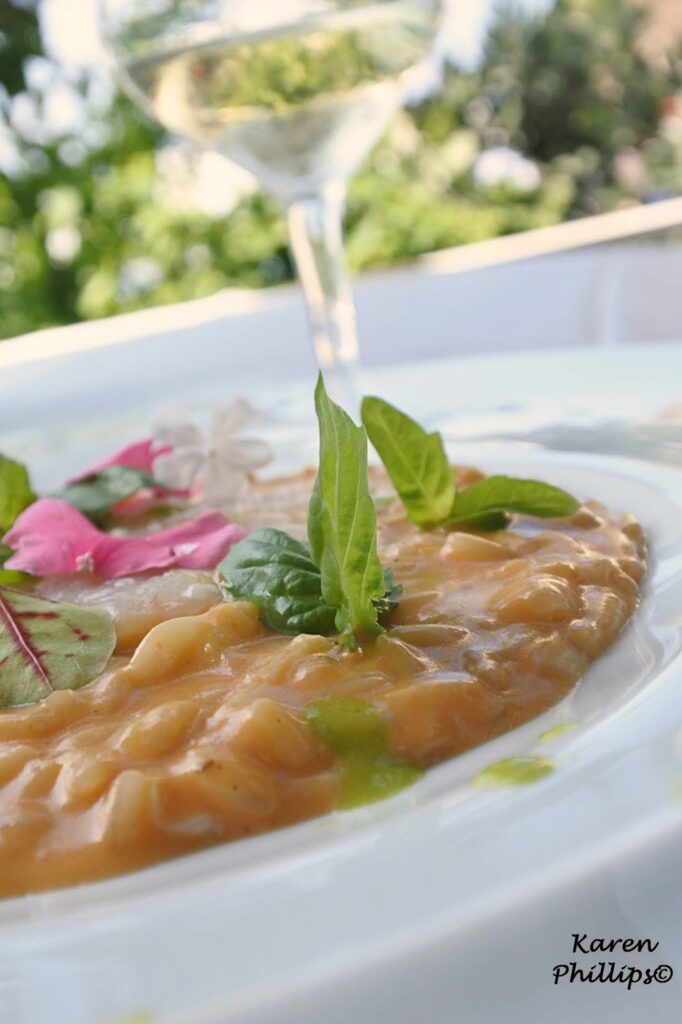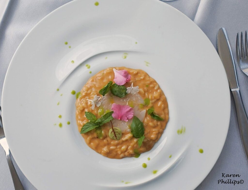 First up, a risotto with a smooth shellfish cream, buratta cheese and eggplant. On top, the chef placed raw shrimp.