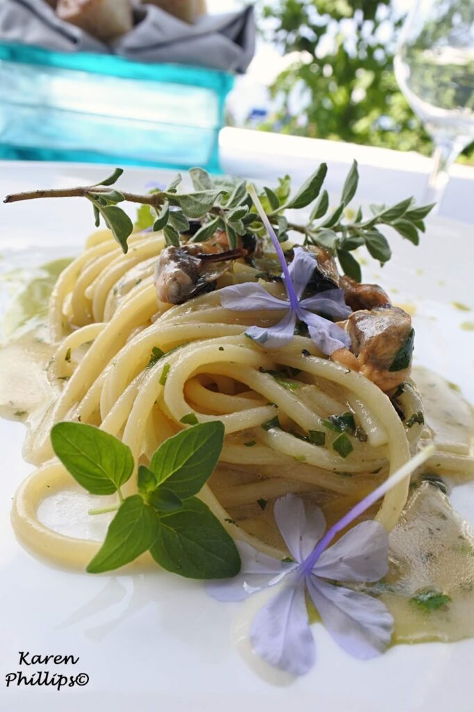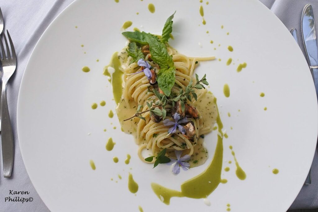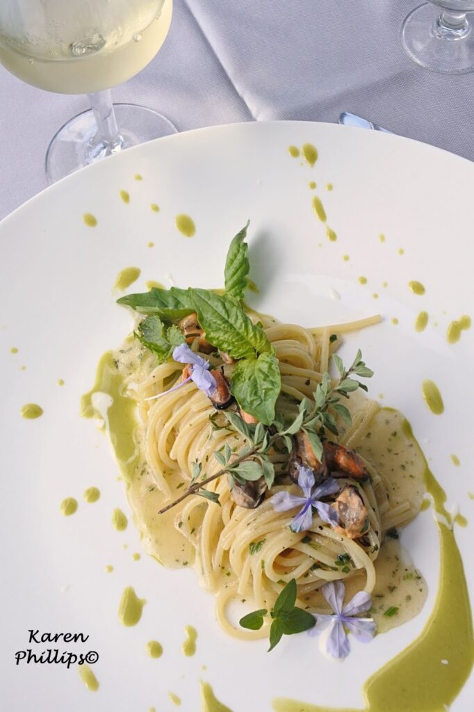 Followed by a super spaghetti with grilled mussels, mint sauce, provola cream, and herbs from the vegetable garden.