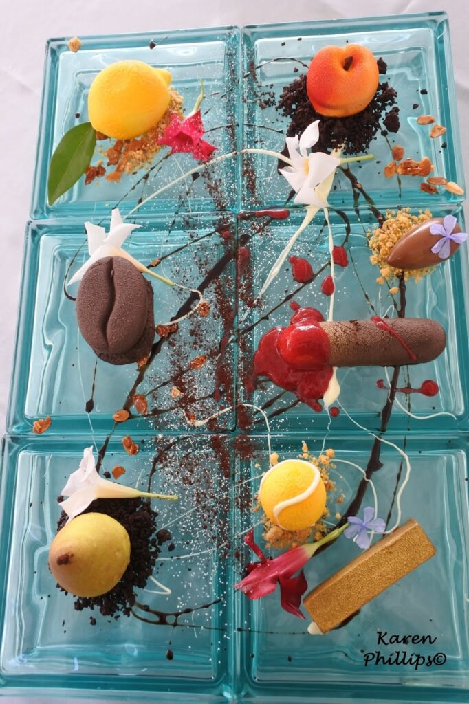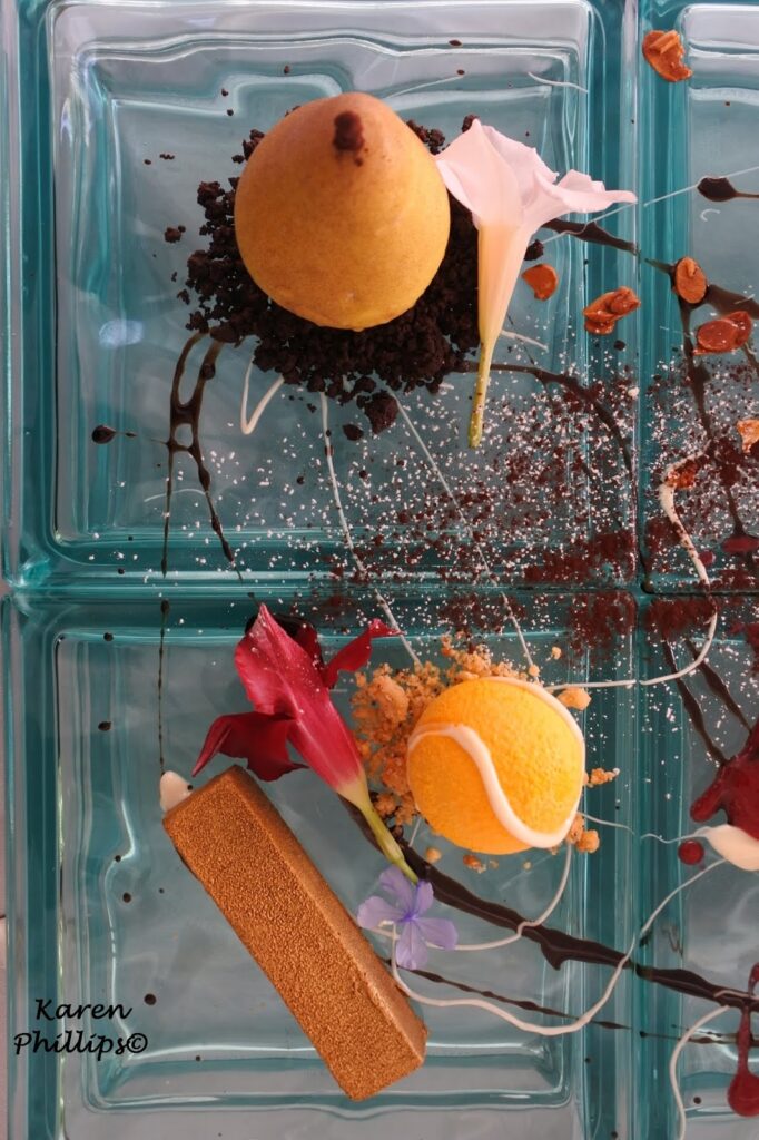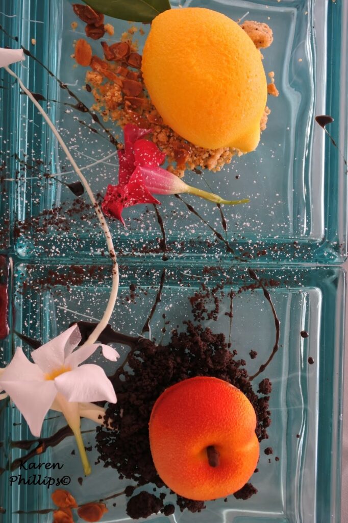 - tennis ball which is a chocolate mousse with carmelized peaches